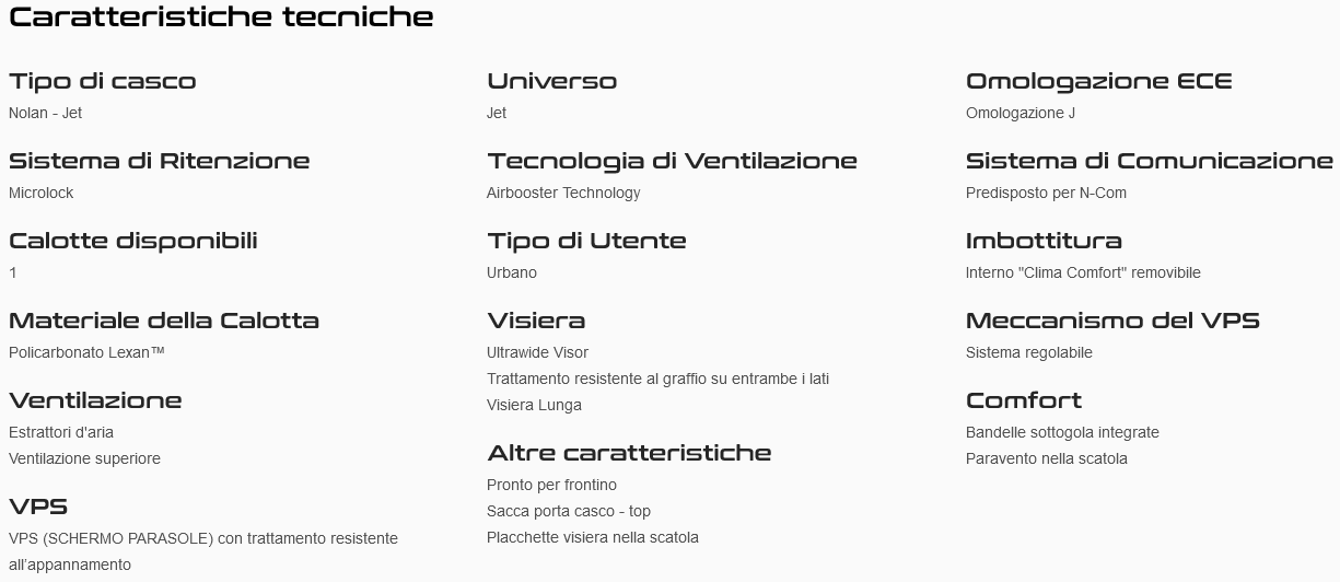 | Caratteristiche | Guscio omologato, Interni completamente removibili, Visiera antigraffio, Antifog incluso, Predisposizione N-COM, Visiera parasole |