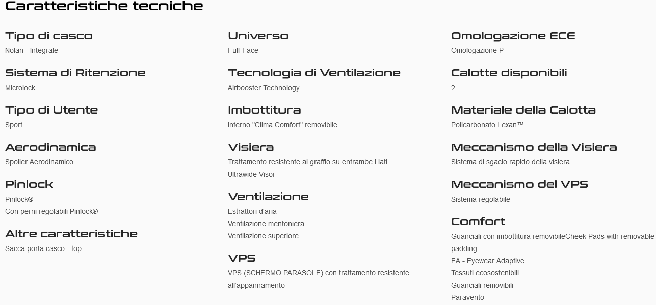 | Caratteristiche | Guscio omologato, Interni completamente removibili, Visiera antigraffio, Antifog incluso, Predisposizione N-COM, Visiera parasole |